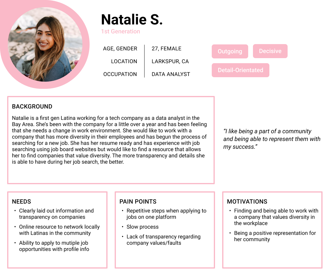 Using the data I gathered during the interviews, I created three personas with different backgrounds but with similar needs. I chose the Natalie persona to build my user flow around since her background included a tech job and I would be able to show a flow of someone already experienced with navigation a job site.